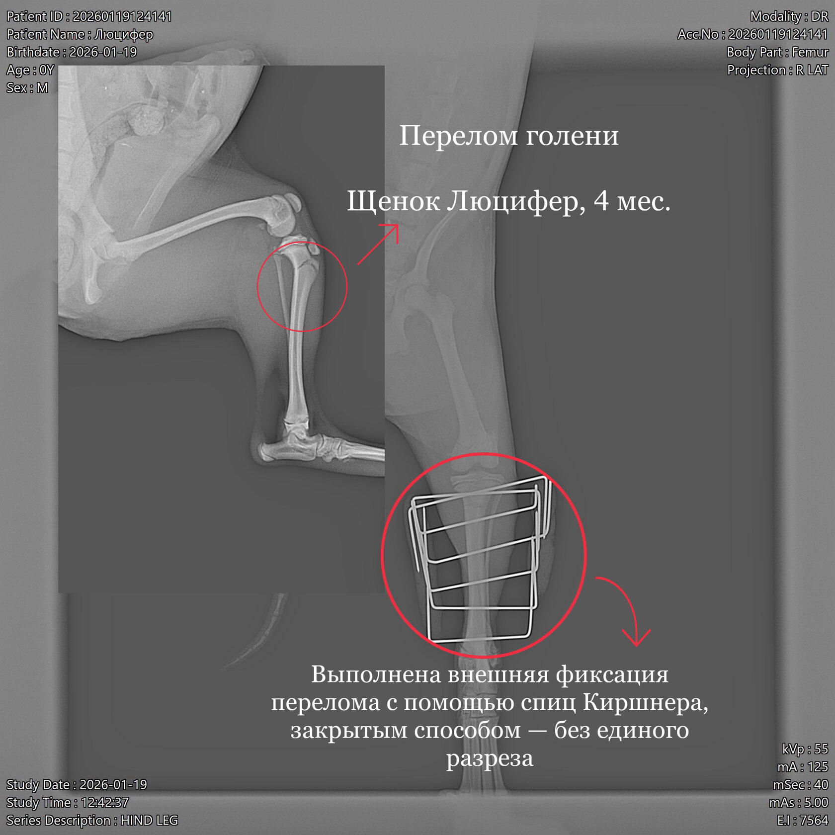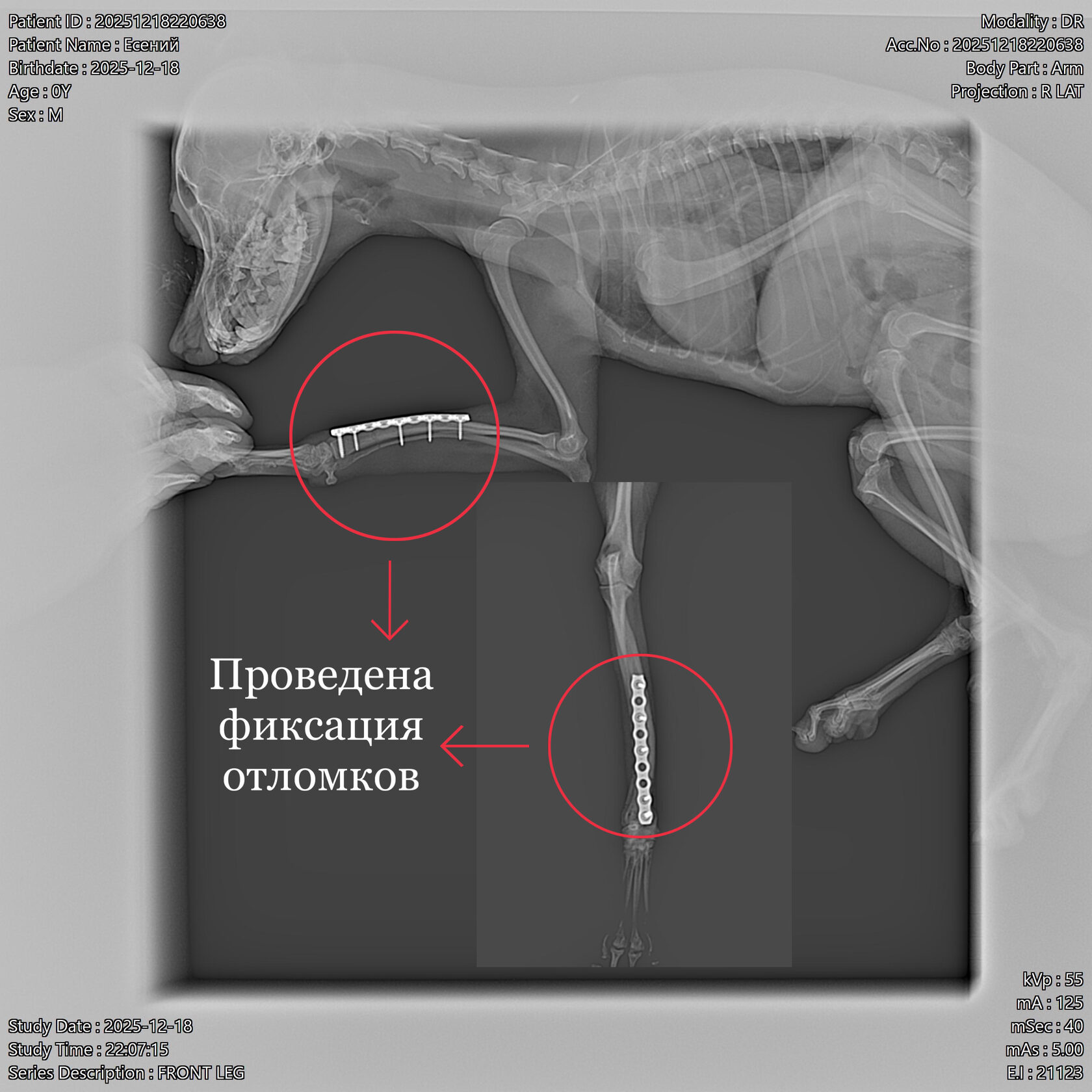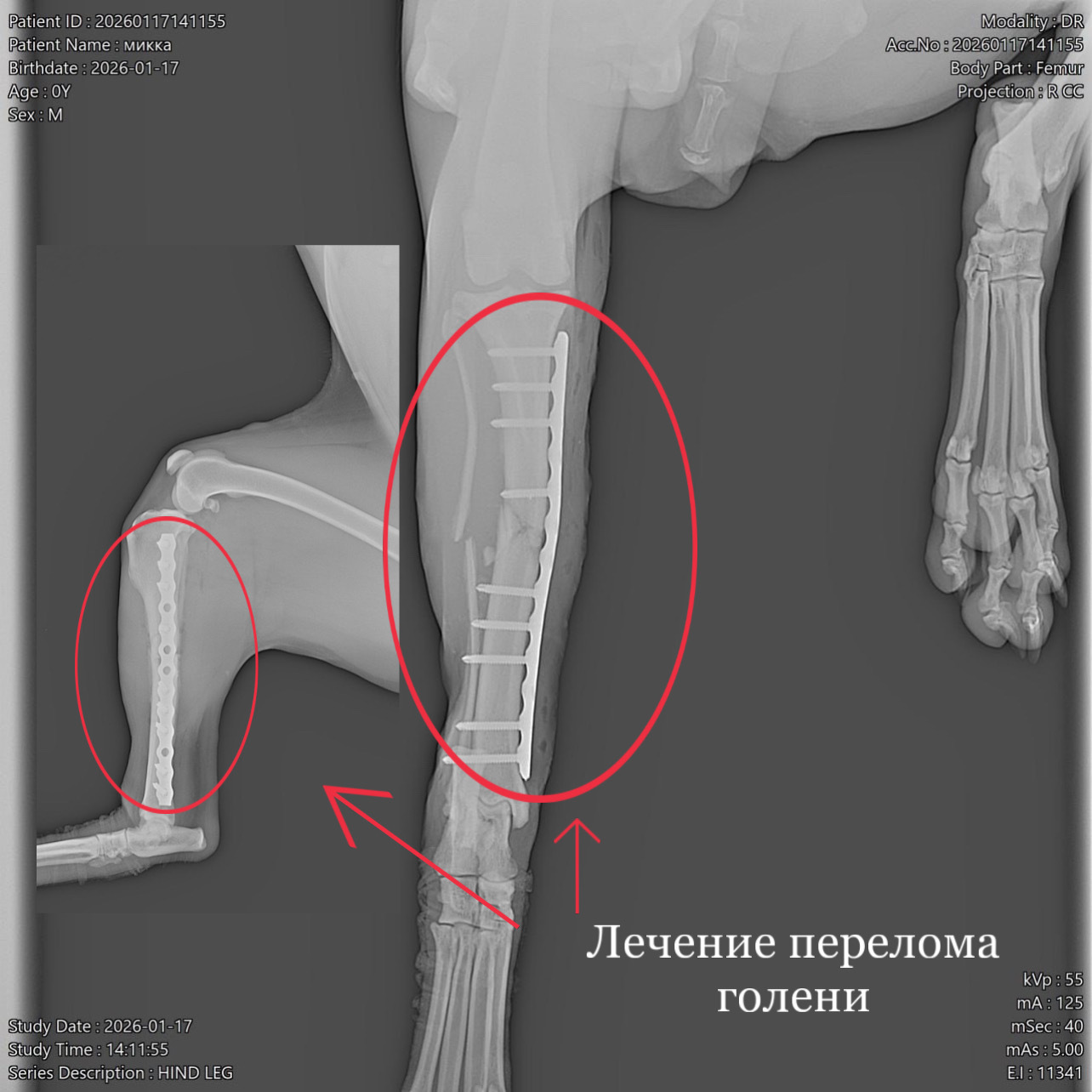 В клинику обратилась собака породы кане-корсо (2 года). Со слов владельцев животное убежало из дома на 11 дней, вернулась с висячей конечностью, в течении 3 дней владельцы искали клинику для проведения операции. По результатам рентгенологического исследования выявлен диафизарный поперечный перелом голени со смещением. По согласованию с владельцами провели металлоостеосинтез трубчатых костей накостной пластиной. В ходе операции было обнаружено образование псевдоартроза (ложного сустава), костные отломки были зачищены и репонированы (сопоставлены) согласно их анатомии. Владельцем были даны послеоперационные рекомендации по уходу за животным.