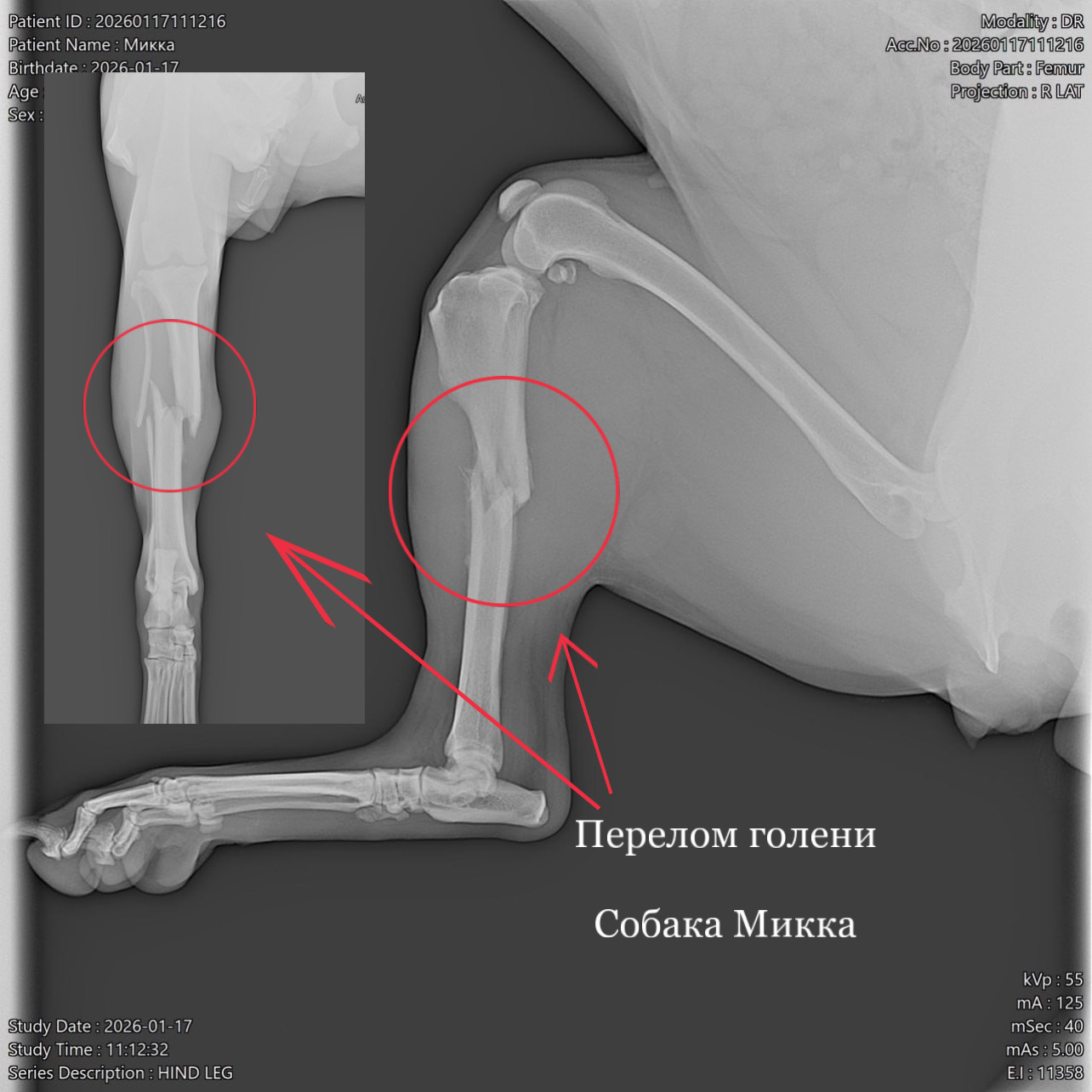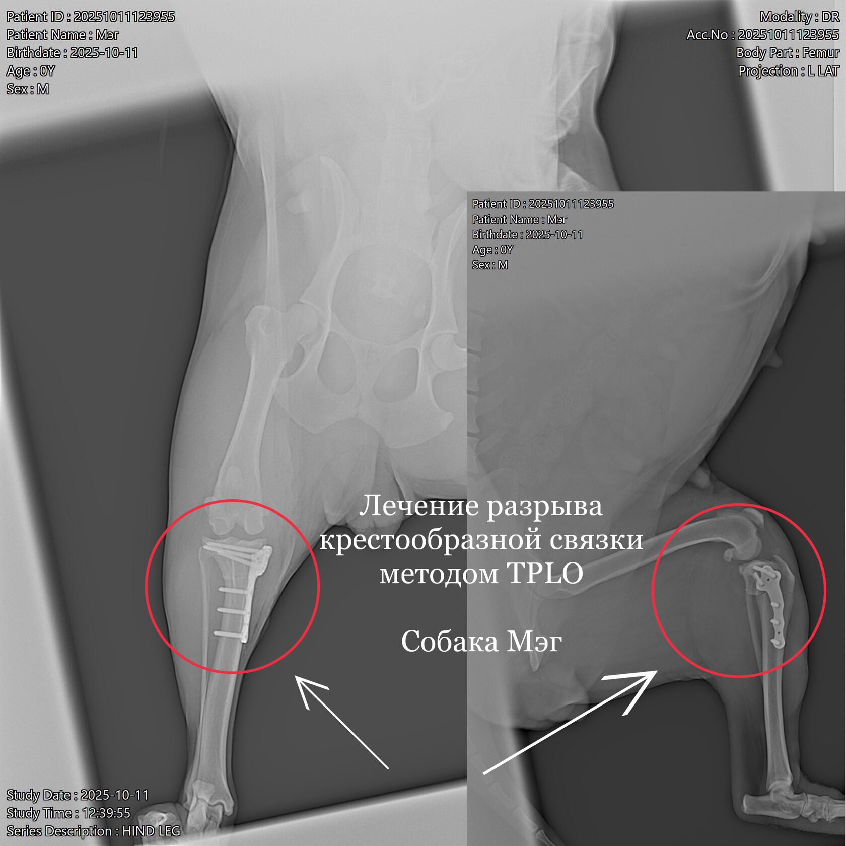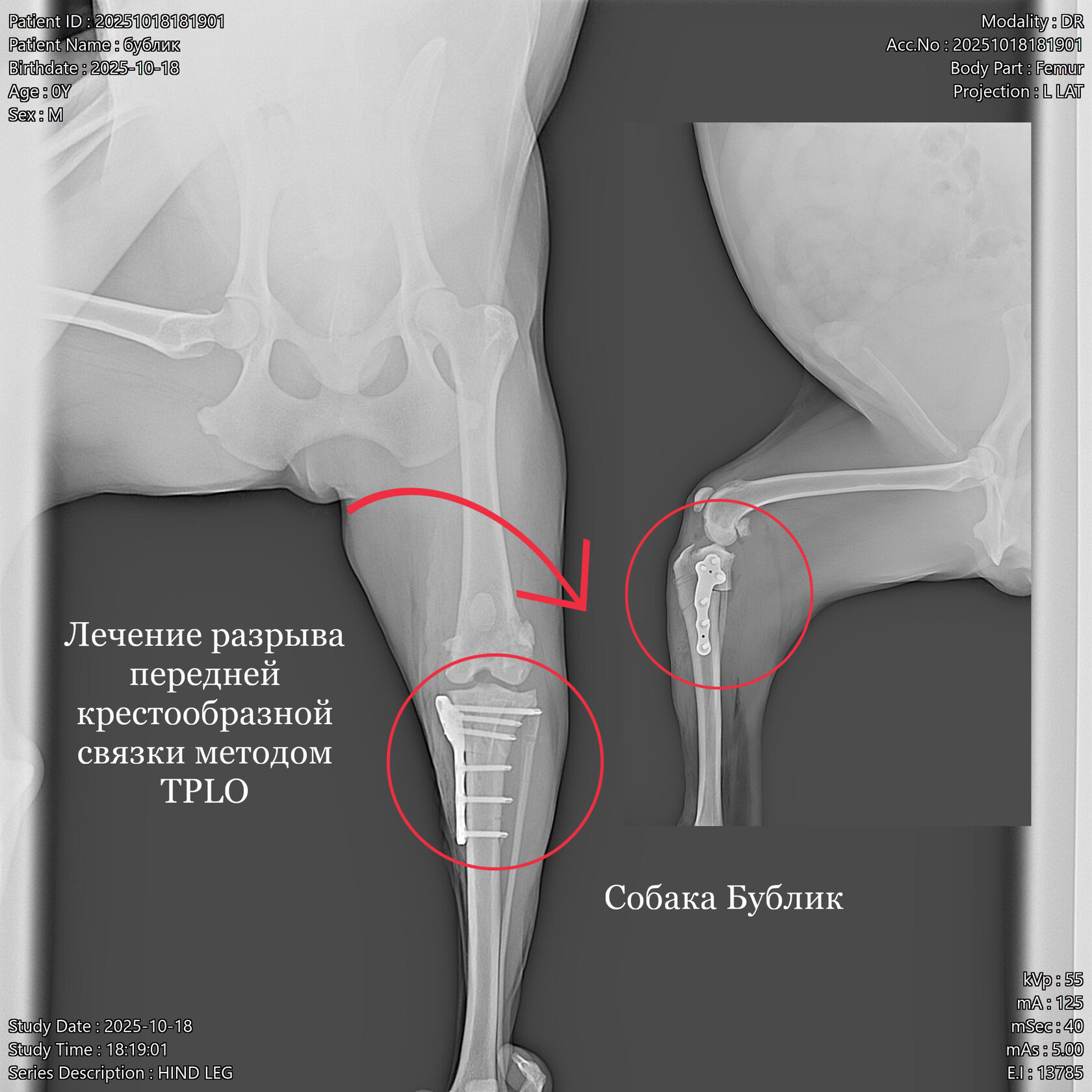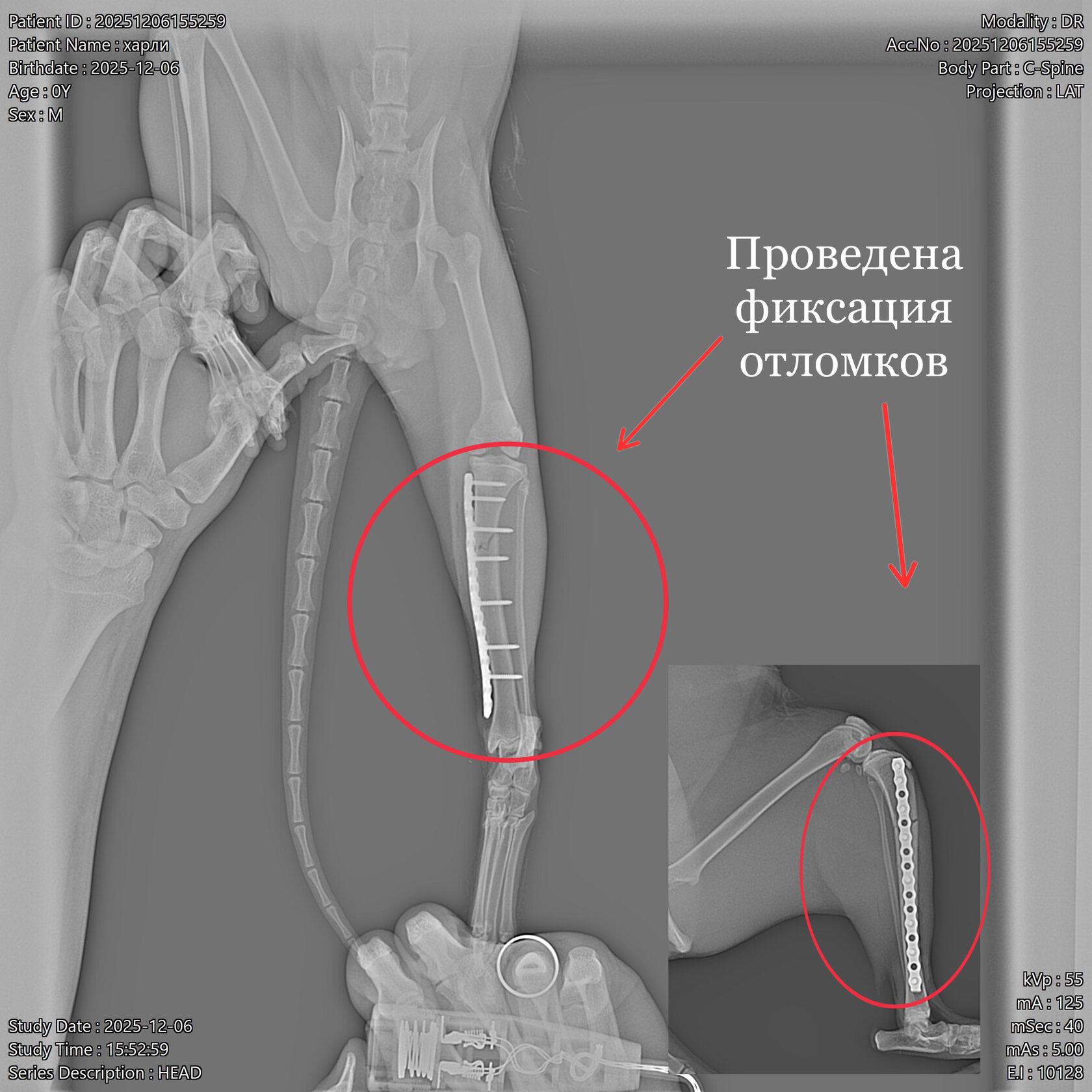 В клинику обратилась собака породы кане-корсо (2 года). Со слов владельцев животное убежало из дома на 11 дней, вернулась с висячей конечностью, в течении 3 дней владельцы искали клинику для проведения операции. По результатам рентгенологического исследования выявлен диафизарный поперечный перелом голени со смещением. По согласованию с владельцами провели металлоостеосинтез трубчатых костей накостной пластиной. В ходе операции было обнаружено образование псевдоартроза (ложного сустава), костные отломки были зачищены и репонированы (сопоставлены) согласно их анатомии. Владельцем были даны послеоперационные рекомендации по уходу за животным.