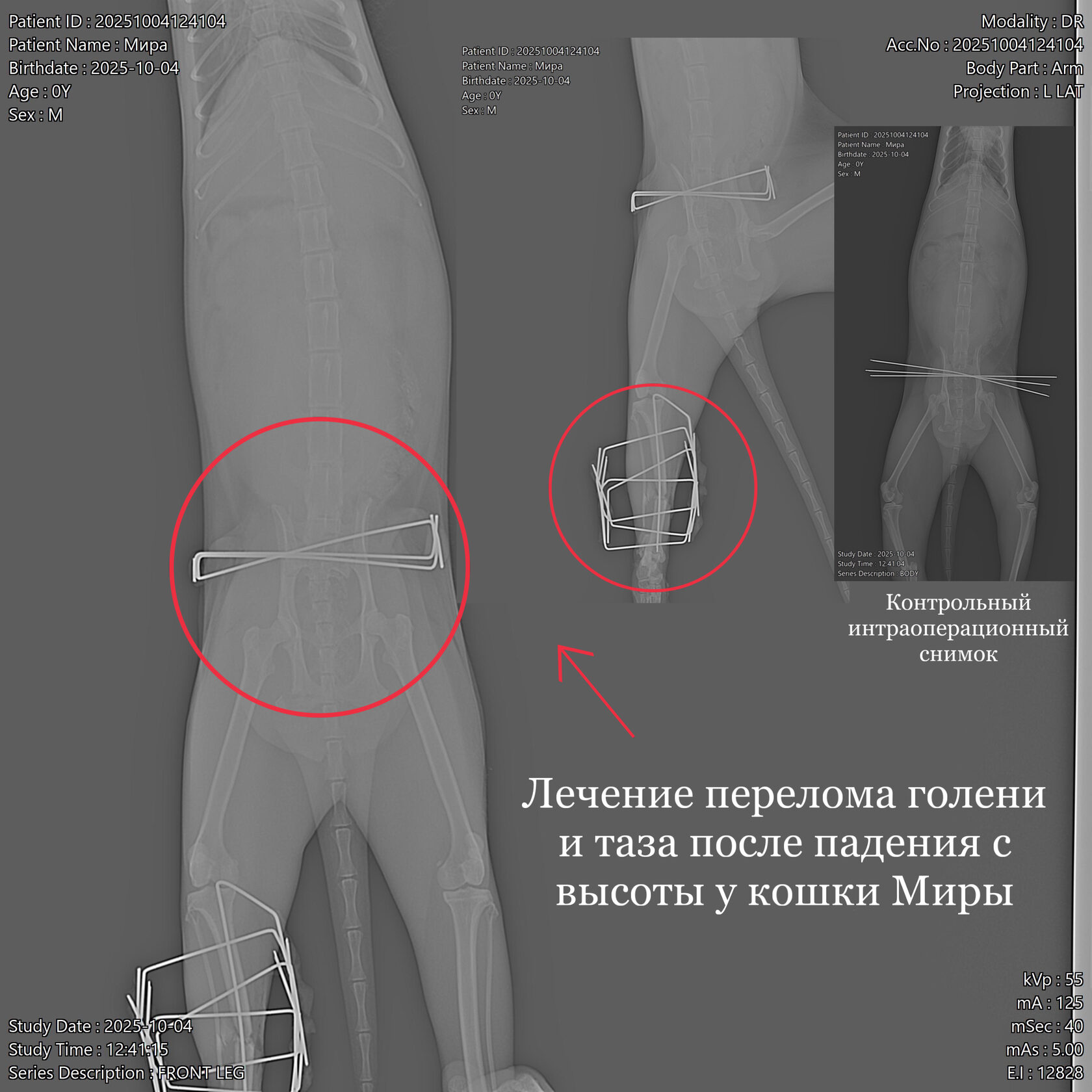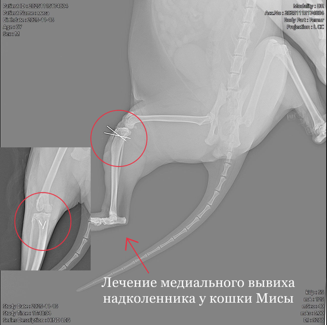 При сложных повреждениях используются остеосинтез, артроскопия и другие современные техники. Лечение проходит под контролем врача-анестезиолога, с учётом возраста и состояния животного.