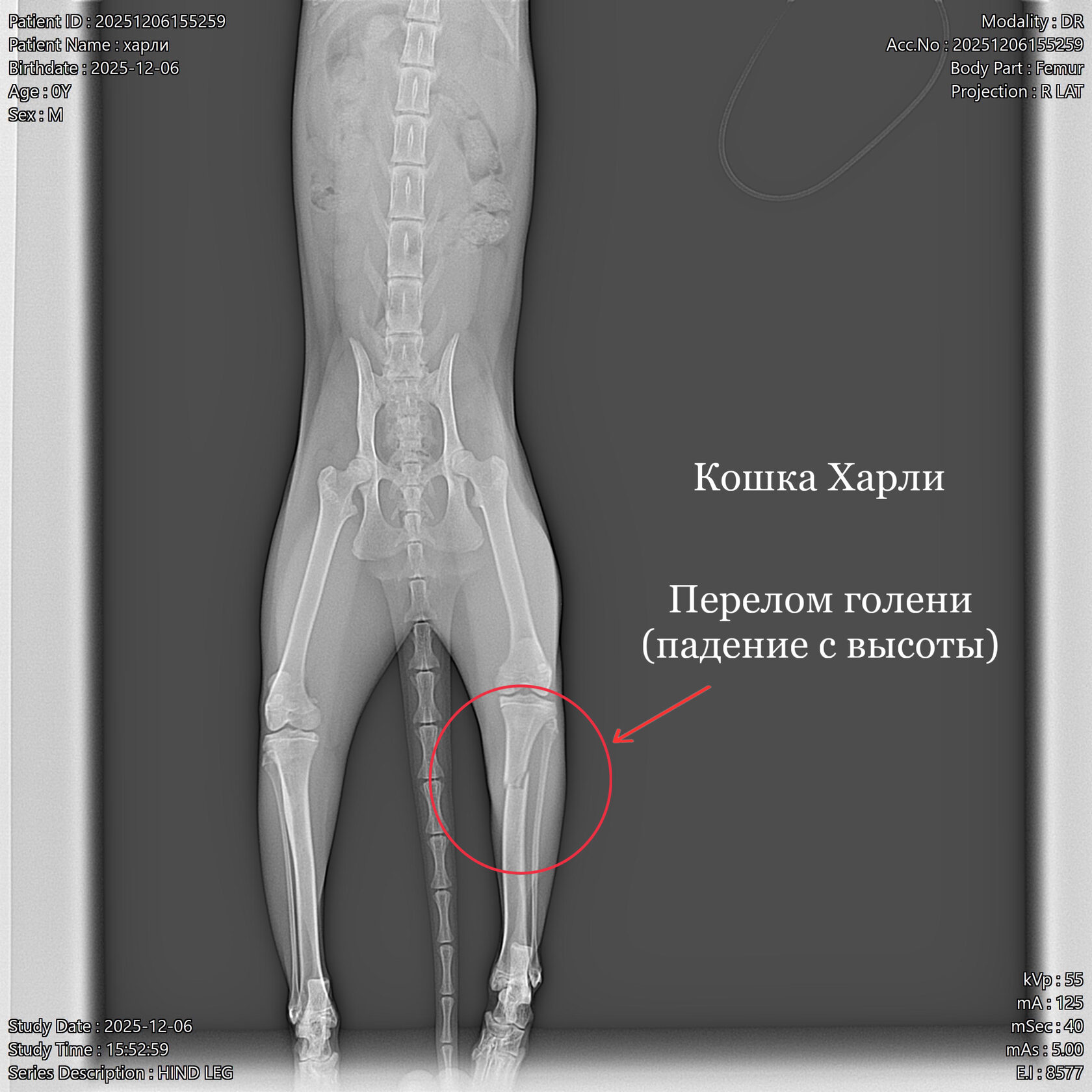 Хоть кошки имеют хорошую мобильность суставов, в отличии от собак, они тоже подвержены переломам конечностей. Такие травмы происходят при падениях с высоты, ущемлениях конечностей. Перелом являются серьезной травмой, требующей немедленной ветеринарной помощи.